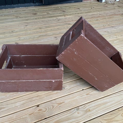 Fire trækasser med metalbeslag. Kasserne har forskellige størrelser og opdelinger, velegnet til opbevaring og organisering. Den ene er til flasker. De har trykte tekster på siderne, herunder 'Karoline', 'Brødfabrikken' og 'Quality Beverage'.Frederiksberg Kommunes biblioteker.