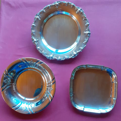 Søgeord: sølvplet, pletsølv, coasters, glasbakker, flaskebakker, borddækning, vintage, retro, Georg Jensen stil, druemønster.