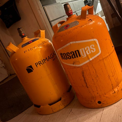 Gasflasker 11 kg. tomme, to stk. 150 kr. Pr. Stk.