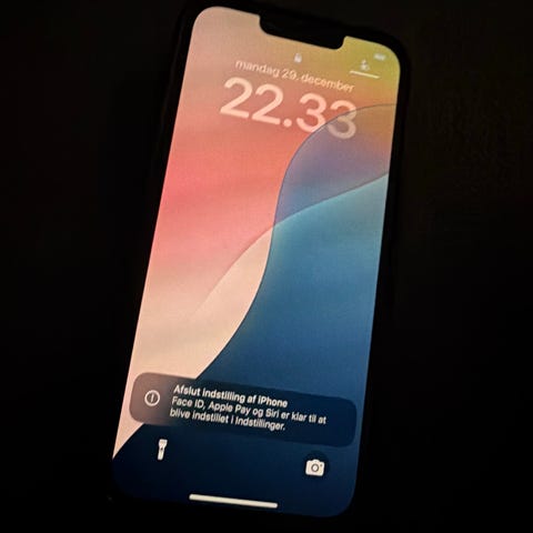 Apple iPhone 13 smartphone med 128 GB lagerplads i sort farve. Enheden har en skærm med Face ID og avancerede sikkerhedsfunktioner. Batteriets maksimale kapacitet er 85 %, og telefonen understøtter optimeret batteriopladning for at forlænge batteriets levetid. Modellen er iPhone 13, og serienummer samt modelnummer er tilgængelige for identifikation.