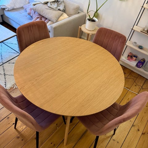 Lyserøde velour spisebordsstole fra Bahne, 200 kr pr stk, købt sidste år. Meget fin stand. Har 4 styks.
