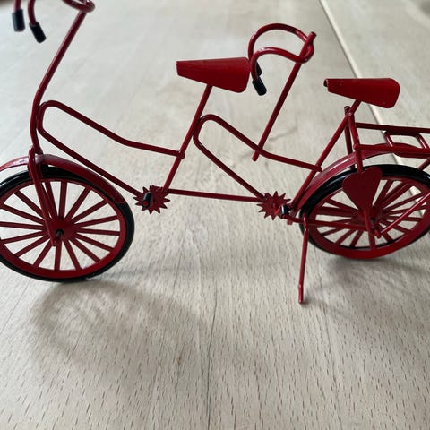 Rød tandem cykel model lavet i metal. Modellen viser en tandem cykel med to sadler, to håndtag og bagagebærer. Velegnet som dekoration eller samlerobjekt.