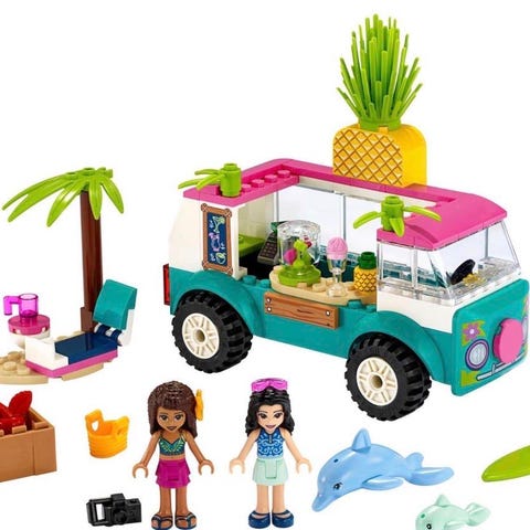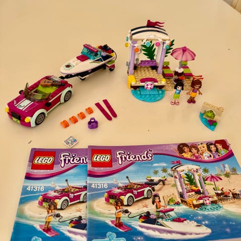 LEGO Friends bil med speedbåd i farverne hvid, grøn og pink. Sættet indeholder en bil med åben kabine og en tilhørende speedbåd. Materialet er plast, og produktet er en del af LEGO Friends temaet.