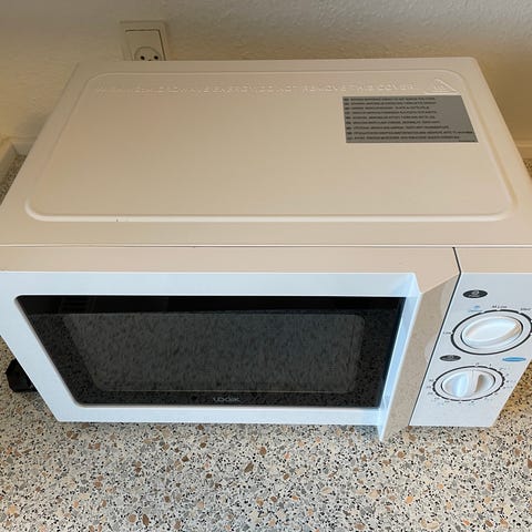 Logik Mikrobølgeovn i sort farve. Mikrobølgeovnen har et enkelt design med drejeknapper til styring af tid og effekt. Indvendigt er den udstyret med en drejetallerken for jævn opvarmning af mad.