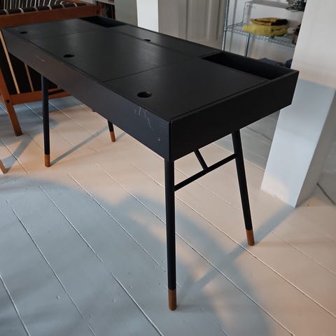 Sort skrivebord med skuffe. Små mærker i bordpladen som kan fjernes med sandpapir og en omgang maling.