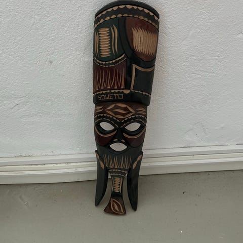 Keywords: Tairen, afrikansk maske, vintage trækunst, signeret træskærerarbejde, etno, retro indretning, vægkunst.