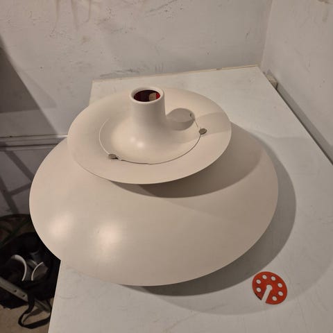 Louis Poulsen PH 5 lampe designet af Poul Henningsen. Lampen har en karakteristisk skærmform og er fremstillet i metal med en hvid finish. Velegnet til brug som loftlampe eller væglampe i boligindretning.