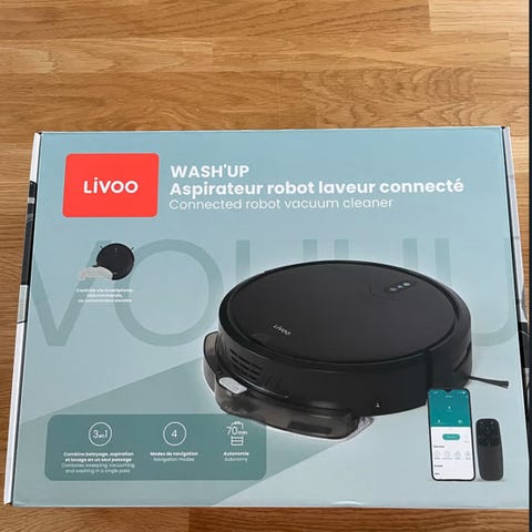 Livoo Wash'Up robotstøvsuger i sort farve. Produktet er designet til automatisk rengøring med mulighed for tilslutning til en app til styring og overvågning. Inkluderer oplader.