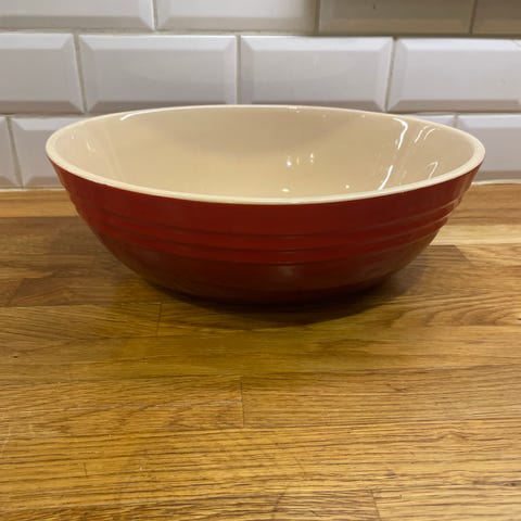 Smuk og solid Le Creuset stentøjsskål i den ikoniske røde farve.
