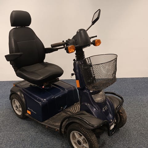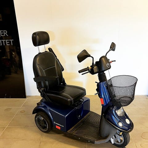 Lille og smart brugt el-scooter til en fornuftig pris. Scooteren er udstyret med en lille forkurv, så du har plads til dine indkøbsvare eller ekstra bagage. Der er desuden rigeligt plads til fødderne og med den lave drejeradius er den perfekte scooter til bykørsel eller indendørskørsel.