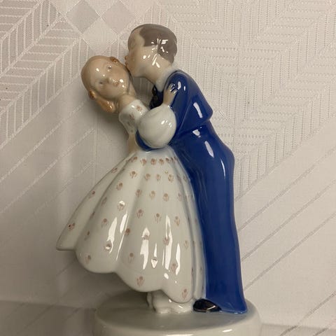 Bing & Grøndahl porcelænsfigur kaldet "Ungdommelig Dristighed" (Youthful Boldness), som forestiller en dreng og en pige, der kysser.
