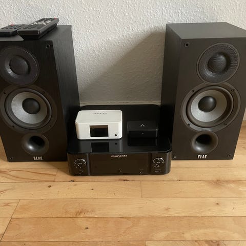 Marantz M-CR510 stereopakker med tilhørende Boston A26 højttalere i hvid farve (er blevet lidt gule i det). Sættet inkluderer forstærker, fjernbetjening, diverse kabler og tilbehør. Højttalerne har tilslutninger bagpå for nem montering. Sættet er egnet til lydafspilning i hjemmet.