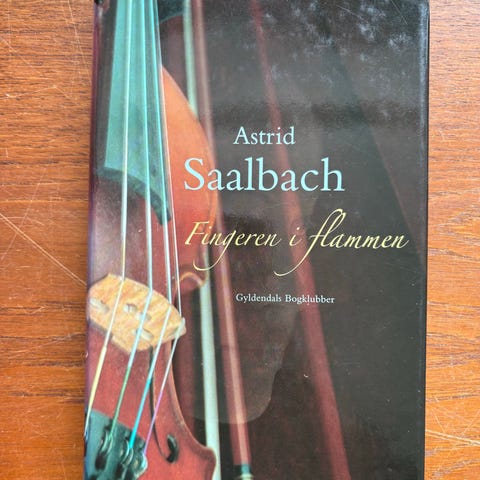 Astrid Saalbach Fingeren i flammen er en bog med titlen og forfatterens navn på omslaget. Bogen har en sort forside med et billede af en violin og en bue. Den indeholder tekst på dansk.