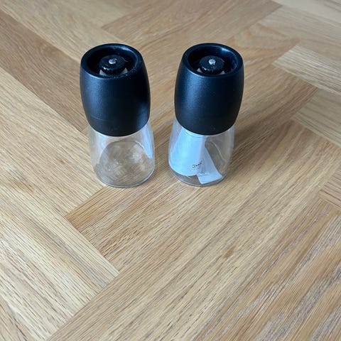 Rosendahl Salt- og peberkværn sæt med sort og klar krop. Materiale inkluderer glas og plastik. Designet til krydderikværning i køkkenet.