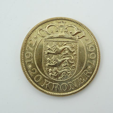 Danmark 20 Kroner mønt fra 2022 med motiv af Dronning Margrethe II på forsiden og et dekorativt mønster på bagsiden. Produceret i forbindelse med dronningens 50 års regeringsjubilæum.