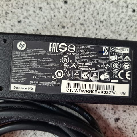 HP 65W Oplader / Lader / Strømforsyning / Adapter model PPP009L, 18,5V, 3.5A. Med det lille runde strømstik 4,8x1,7mm. Der kan medfølge strømledning med 3-benet stikprop eller strømledning med 2-benet stikprop.