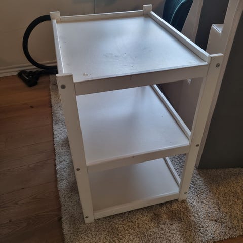IKEA puslebord med opbevaring i grøn farve. Malingen skaller af flere steder, så den skal nok have en ny omgang.