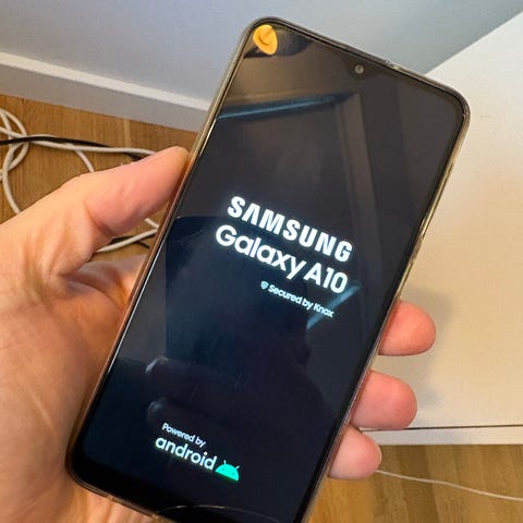 Samsung Galaxy A-series smartphone med 128GB hukommelsesstørrelse. Enheden har et reflekterende bagsidecover med synlige brugsspor. Fungere fint men batteri har set bedre dage.