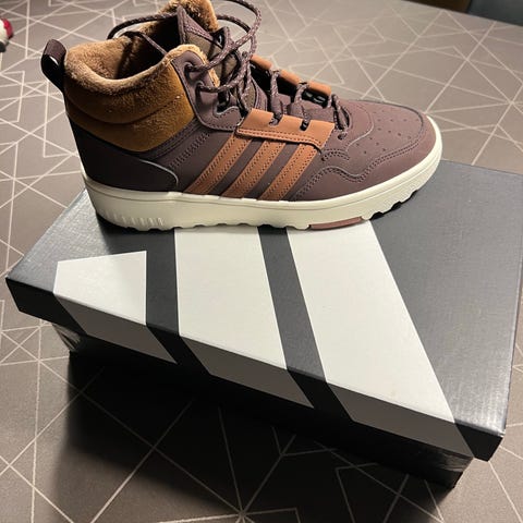 Adidas Hoops mid-top sneakers, som er kendt for deres basketball-inspirerede design og komfortable, polstrede krave. Mid-toppen giver ekstra støtte til anklen. Næsten ikke brugt. Kan bruges som let vinter-overgangsstøvle.