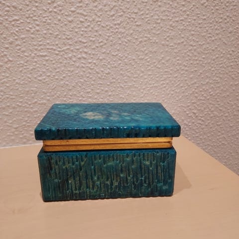 Skrinet er i lyse farvenuancer med en grå bund. Det er købt i Belgien på en antik- & vintagemesse for år tilbage.