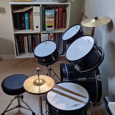 børnetrommesæt i sort farve. Sættet inkluderer basstromme, lilletromme, to tom-toms (en knækket af) og bækken samt trommestikker. Designet til børn med mindre dimensioner og let tilgængelige trommer.