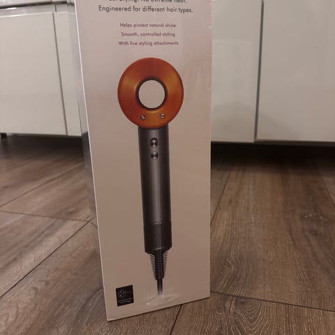 Ubrugt Dyson Supersonic hårtørrer i mørkeblå med tilbehør.