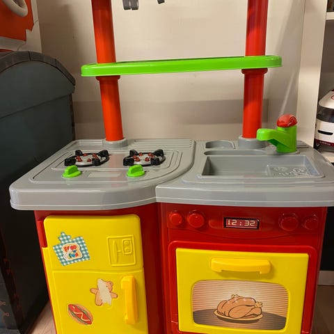 Legekøkken gives væk. Mangler overdelen, men er ellers funktionsdygtigt med lyde og lys i komfuret.
