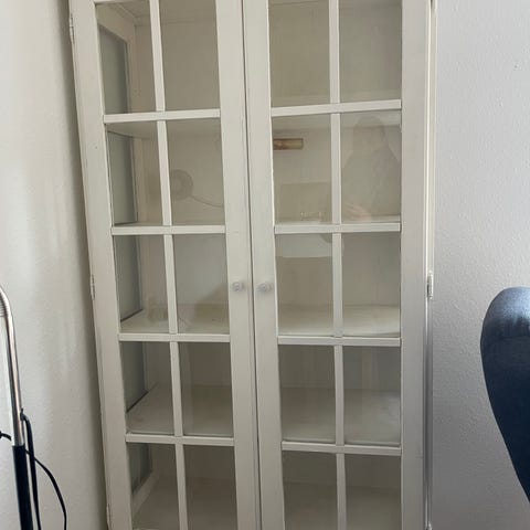 Vitrineskab med 4 hylder og 1 skuffe. Skuffen binder lidt og skal have et venligt skub for at lukke. Købt for ca. 6 år siden.
