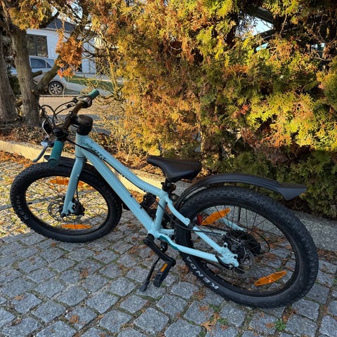 Kildemoes Mountainbike med 20 tommer hjul, sort og orange farve. Cyklen har affjedret forgaffel, skivebremser og robust stel i metal. Egnet til børn og unge til terræn- og fritidscykling.