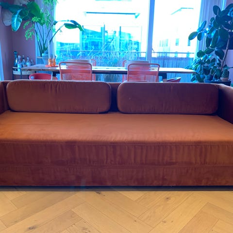 Fremstår næsten som ny, har enkelt plet ved kanten og hul under sengen, som ikke ses. Disse fejl var der faktisk ved levering, og ikke noget der er kommet af brug.
