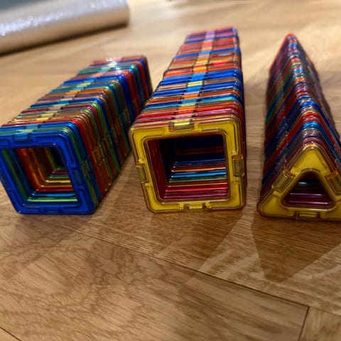 Samling af Magformers, magnetisk byggesæt til børn bestående af forskellige magnetiske geometriske former i flere farver og størrelser. Velegnet til leg og læring omkring magnetisme og geometri.