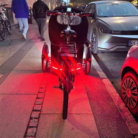 Den er fuldt udstyret og klar til brug. Herunder: Elsystem blev udskiftet i sommer 2025 (pga. defekt), stort batteri med to nøgler og lader, klar frontkasse så ungerne kan se ud, fastmonteret baglygte, forlygter, ringlås med to nøgler, kædelås med to nøgler, nyere kaleche og sæde med hynde og seler.