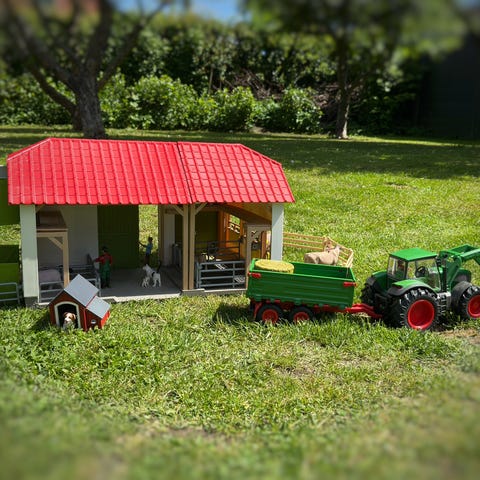 Schleich legetøjsbondegård med forskellige tilbehør som silo, hegn, halmballer, redskaber og figurer. Sættet indeholder elementer til at skabe en detaljeret bondegårdsscene med fokus på landbrugsaktiviteter.