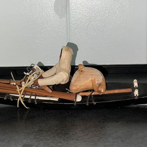 Grønlandsk fanger kajak. Meget fint lavet og skind i god stand. 55cm lang. Med fangstline i skind og diverse spyd etc, dog tror jeg figuren mangler en pagaj.