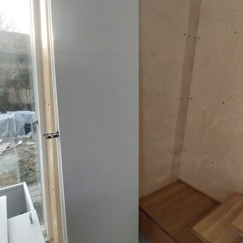 Hvidkalkeret HTH skabslåge til garderobeskab, er højrehængt, med forboret huller til skabshængsler, højde 211,2 cm og bredde 59,5 cm, der sidder stadig beskytteelsesfilm på lågen men har en meget lille ridse på den ene kant.
