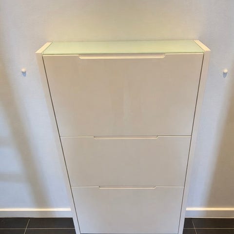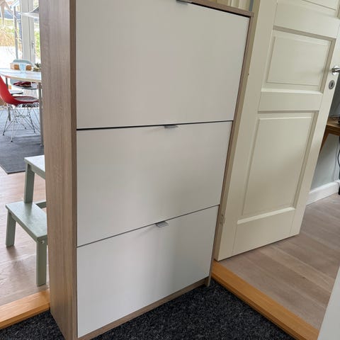 Skoskab fra Ilva med plads til 18 par sko gives væk. Det nederste skab er i stykker, men kan repareres, hvis man har lidt snilde. Ellers i rigtig fin stand. Kvittering medfølger. Det skal selv bæres op fra kælderen. Det befinder sig i Helsingør.