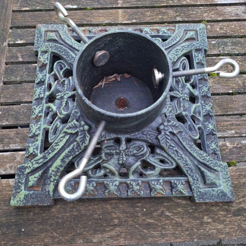 Juletræsfod med stjerneformet træbase og metalholder. Designet til at holde juletræet stabilt. Materialer: træ og metal.