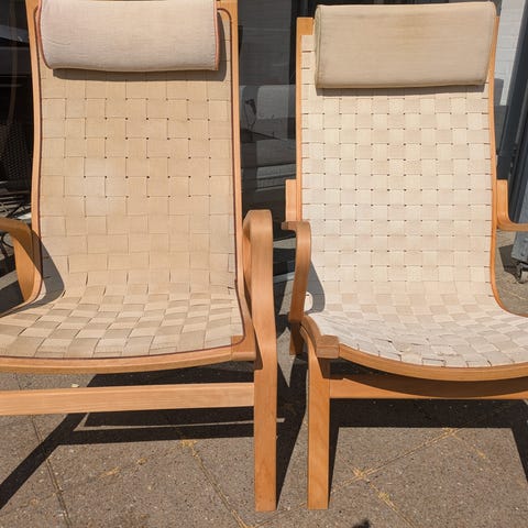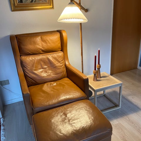 Høj lænestol med "ører". Ligner Børge Mogensens øreklapstol. Lys grå.
