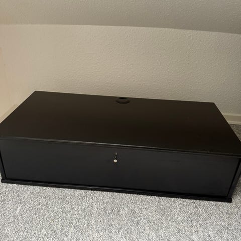 TV-bord med plads til skjult kabelføring og opbevaring. Passer ideelt til et TV mellem 55” og 65”. Elegant sort tv-bord eller skænk, med små overfladiske ridser. Deraf prisen. Nypris 3.500 kr.