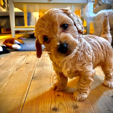 Vokser op med andre hunde, børn og mennesker i vores køkken.