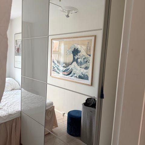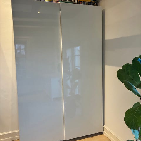 Sælger et stort og velholdt IKEA PAX garderobeskab i fuld højde med skydedøre. Skabet har et roligt og moderne udtryk og fremstår solidt og funktionelt.