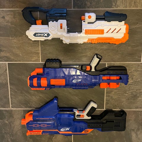 Nerf børne legetøjsvåben i forskellige modeller og farver, inklusive tilbehør som skumdarts og magasiner. Sættet indeholder flere våben med variation i størrelse og design, egnet til leg og udendørs aktiviteter.