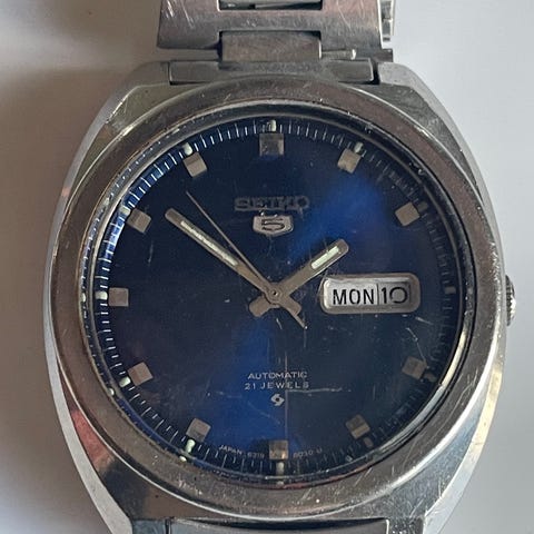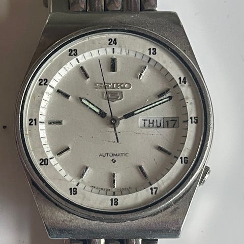 Seiko 5 Automatic bordeaux rød skive, uret går men trænger til at få nyt glas eller oppudset det der er, ingen rem medfølger, kan hentes i 6800 Varde eller sendes med GLS