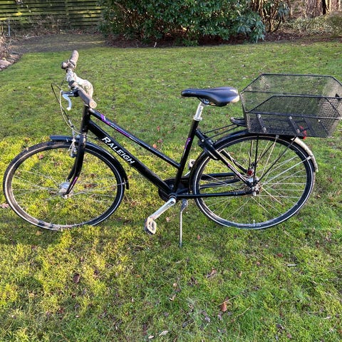 Raleigh Bycykel til kvinder med sort stel. Cyklen har 7 gear, kurv foran, forlygte og baglygte samt bagagebærer. Designet til almindelig bykørsel. Købt til vor gamle mor som aldrig fik den brugt.