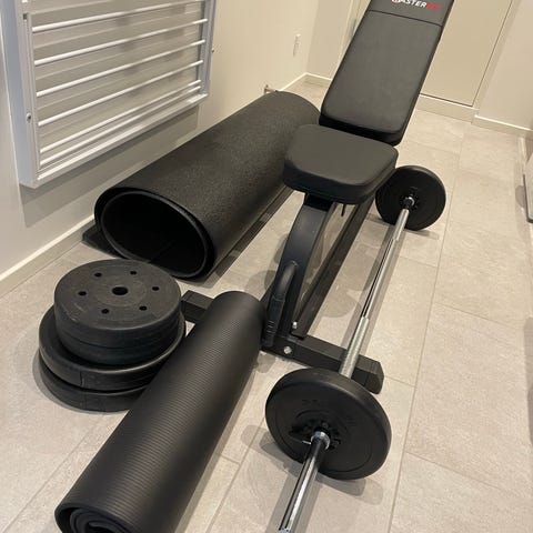 M Ultimate E Series træningsbænk med sort polstring. Bænken måler cirka 110 cm i længden højden kan justeres 37-56 cm og bredden er 46 cm står som ny da den stort set ikke er brugt , jeg har også håndvægte til salg der passer til bænken. 4 gulvfliser og 2 små håndvægte kan medfølge
