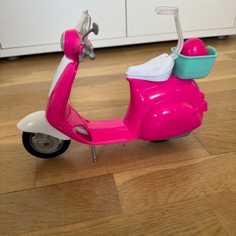 Barbie fjernstyret scooter legetøj i rød farve med grå sæde og detaljer. Scooterens design inkluderer et håndtag med spejle, forlygter og en fjernbetjening med knapper til styring.