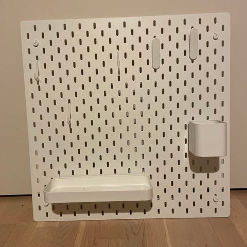IKEA Viggja 2-niveau bakkebord / sengebord i hvid. Består af to aftagelige bakker og et foldbart metalstel. Bakkerne sidder godt fast, så det er stabilt. Anvendelig til opbevaring og organisering i hjemmet.