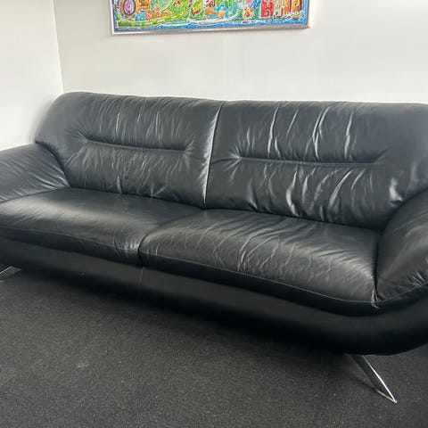 3+2 sofaer fra Hjort Knudsen. I god stand, men med lidt brugsmærker. Det ene sæde kan måske med fordel indfarves med lidt sort læderfarve. Stadig supergode at sidde i. Der mangler et par «plastikdimser» til at have på benene.