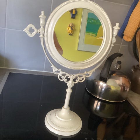 By Astrup bordspejl med rund spejl og skuffe. Spejlet har en hvid ramme og ben i træfarve. Skuffen har et dekorativt ornament i form af en sommerfugl.