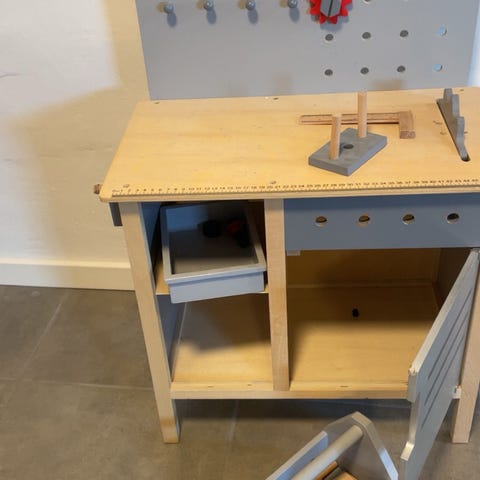Hjemmebygget legebord i træ der er malet hvidt. Der kan være 3 kasser nedenunder til opbevaring. Passer perfekt til IKEAs kasser SAMLA (medfølger ikke). Har være brugt til Lego da den høje kant sikre at brikkerne ikke falder ud. Bordet måler 121 x 60 og er 65 cm højt (inkl kant).
